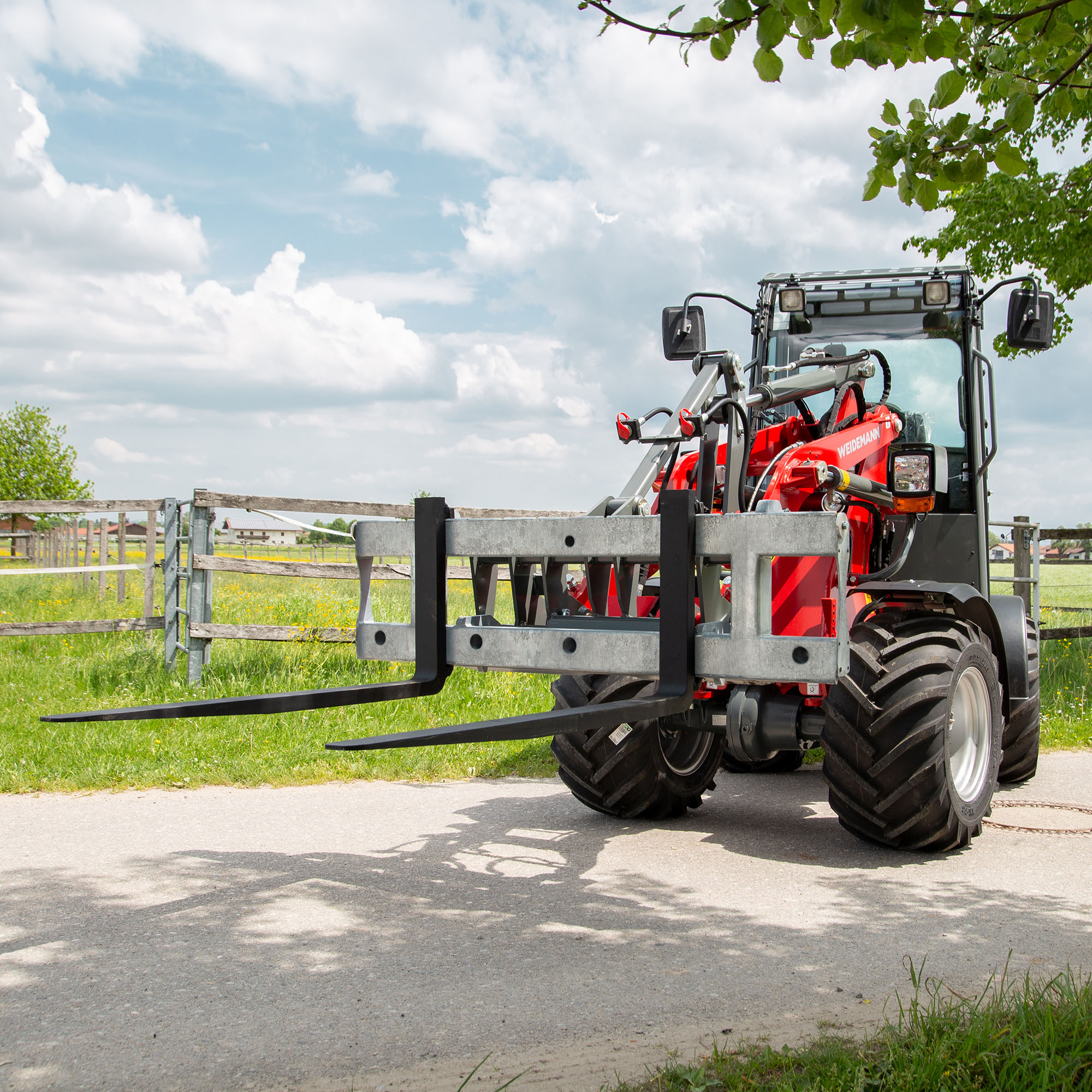 Les exigences élevées requièrent une qualité supérieure. C'est pourquoi il existe par exemple en option un arceau de sécurité spécial en acier pour la fourche à palette, afin de pouvoir transporter entre autres de grandes balles de foin en toute sécurité – même sur de longues distances.