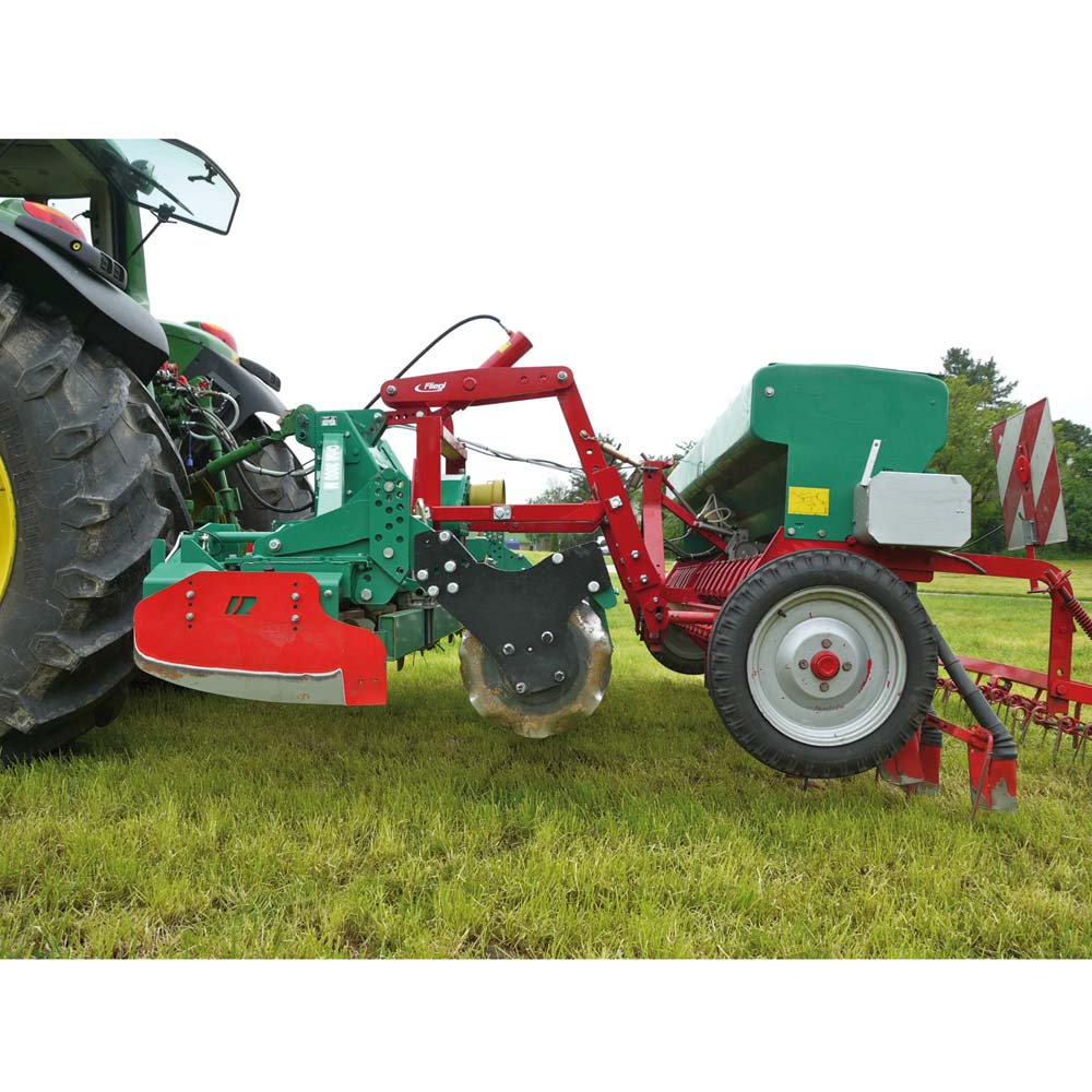 » La symétrie singulière et le vérin hydraulique simple effet lourd permettent aux semoirs d'être surélevés et orientés sans problème par rapport à l'essieu arrière du tracteur. Le centre de gravité du module combiné se déplace alors vers l'avant. L'essieu avant du tracteur reste chargé et la maniabilité est maintenue.