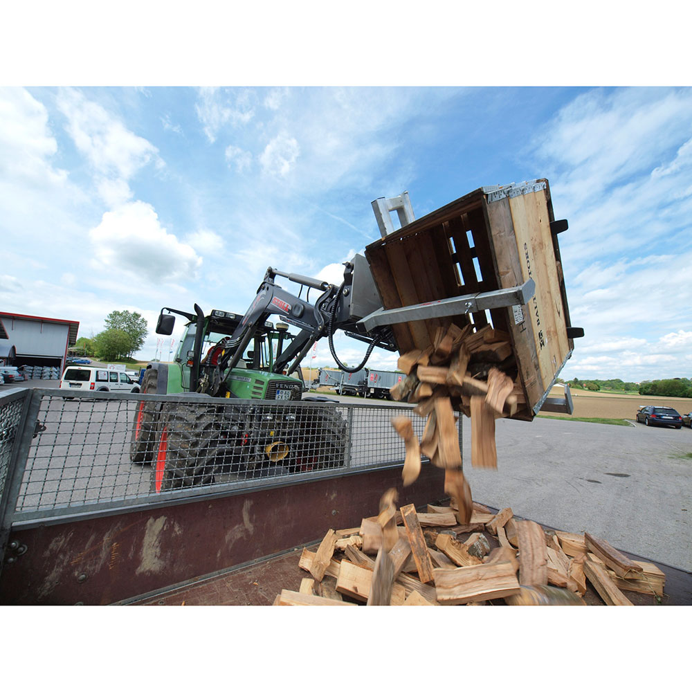 Ce retourneur de containers, boîtes et caisses facilite le chargement et le déchargement des produits de toutes sortes, peu importe qu'il s'agisse de pommes de terre, de céréales, de ferraille ou de petites pièces de machines et d'appareils. L'attelage Euro permet un couplage/découplage rapide du retourneur. Deux fourches à palette forgées saisissent chaque conteneur. Un bras de maintien latéral réglable dans la longueur et la largeur empêche les conteneurs de glisser.