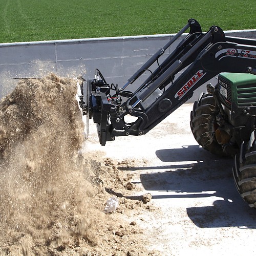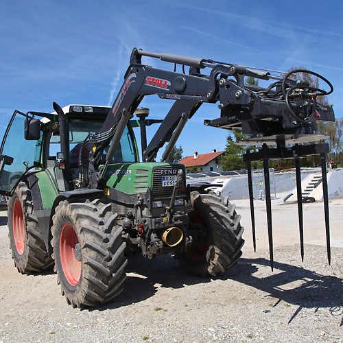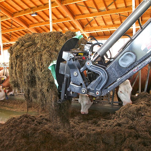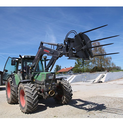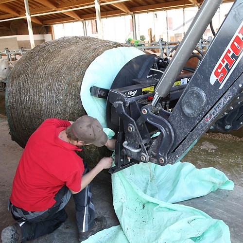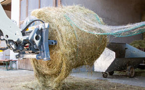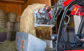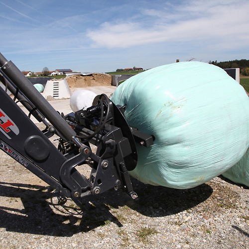 Déroulement simple et rapide des balles d'ensilage et de paille via l'hydraulique du tracteur – convient également au transport.