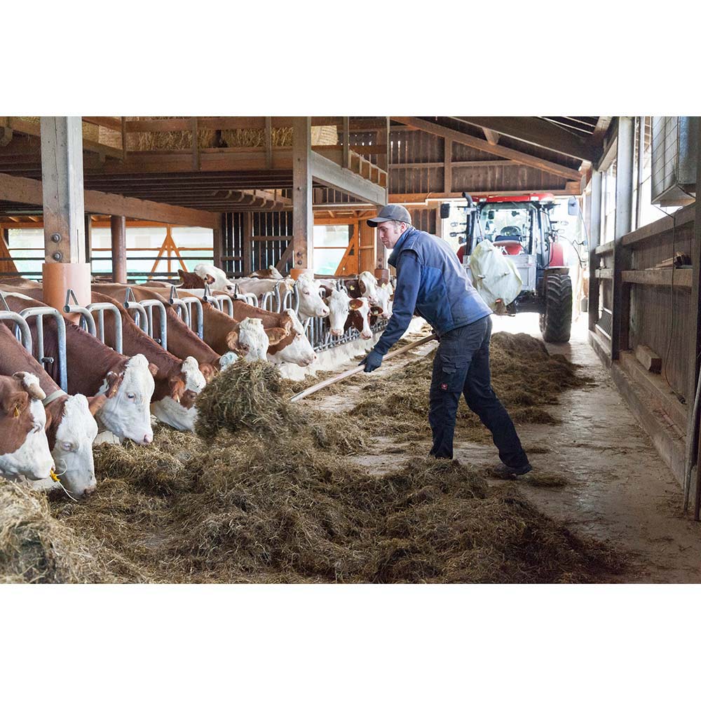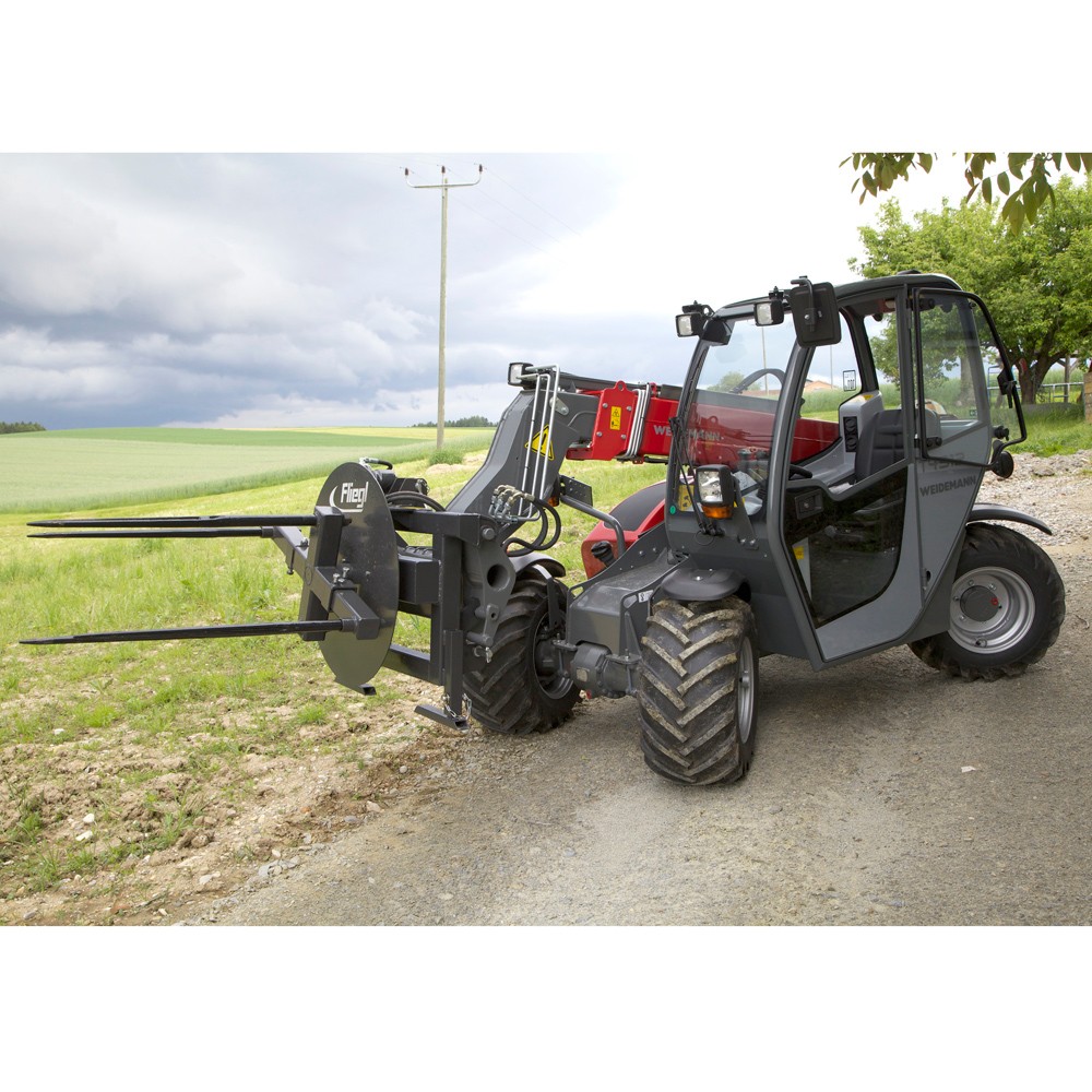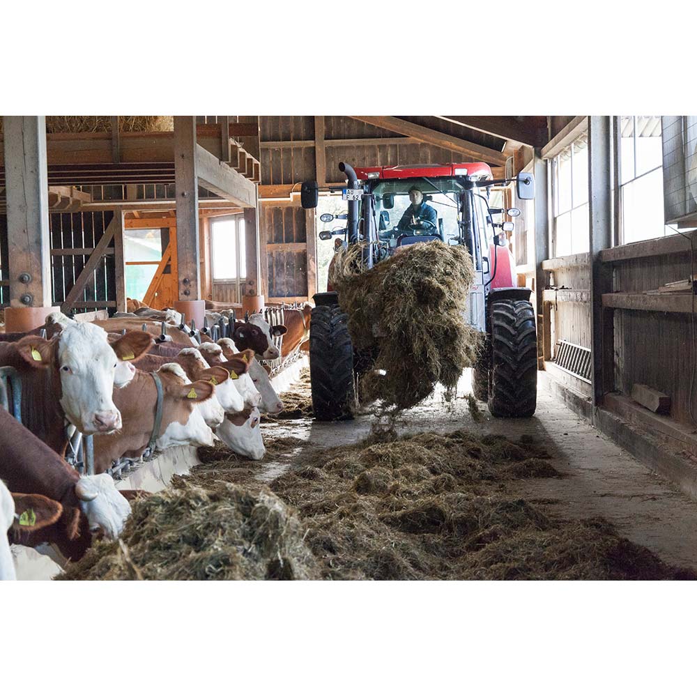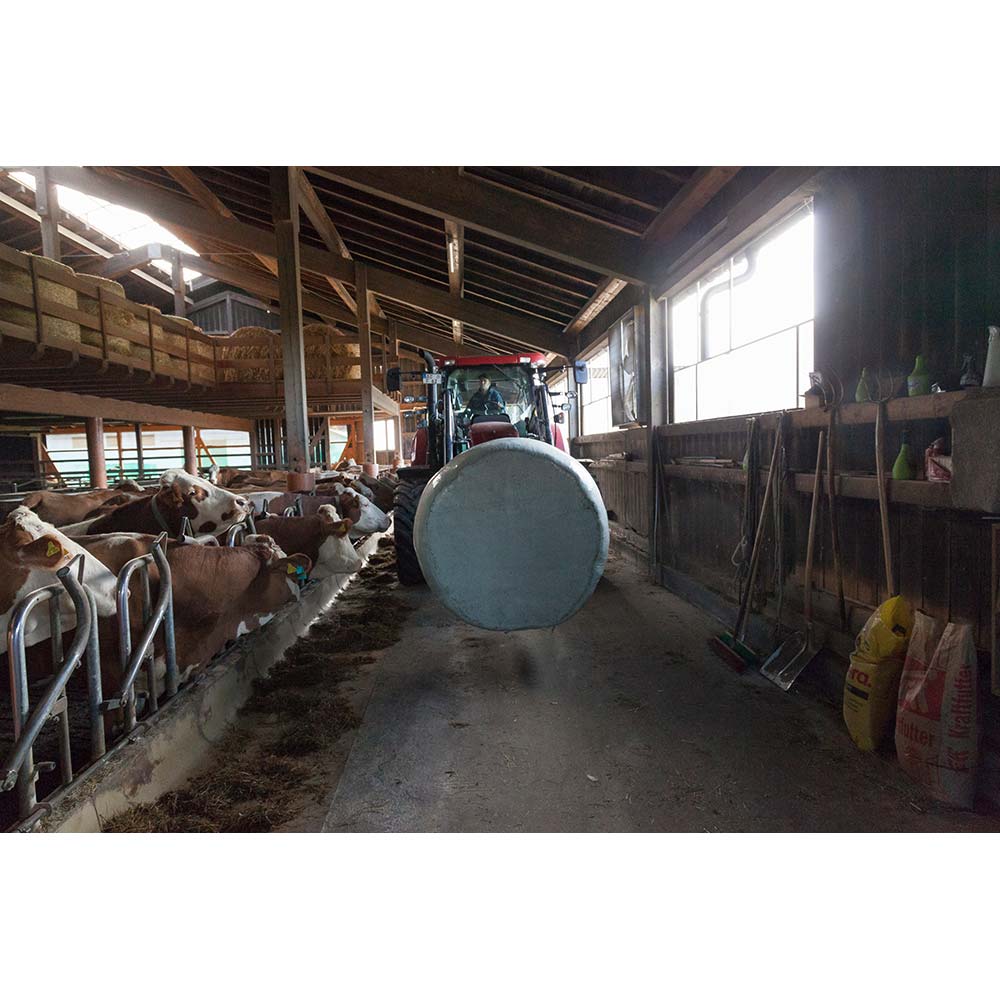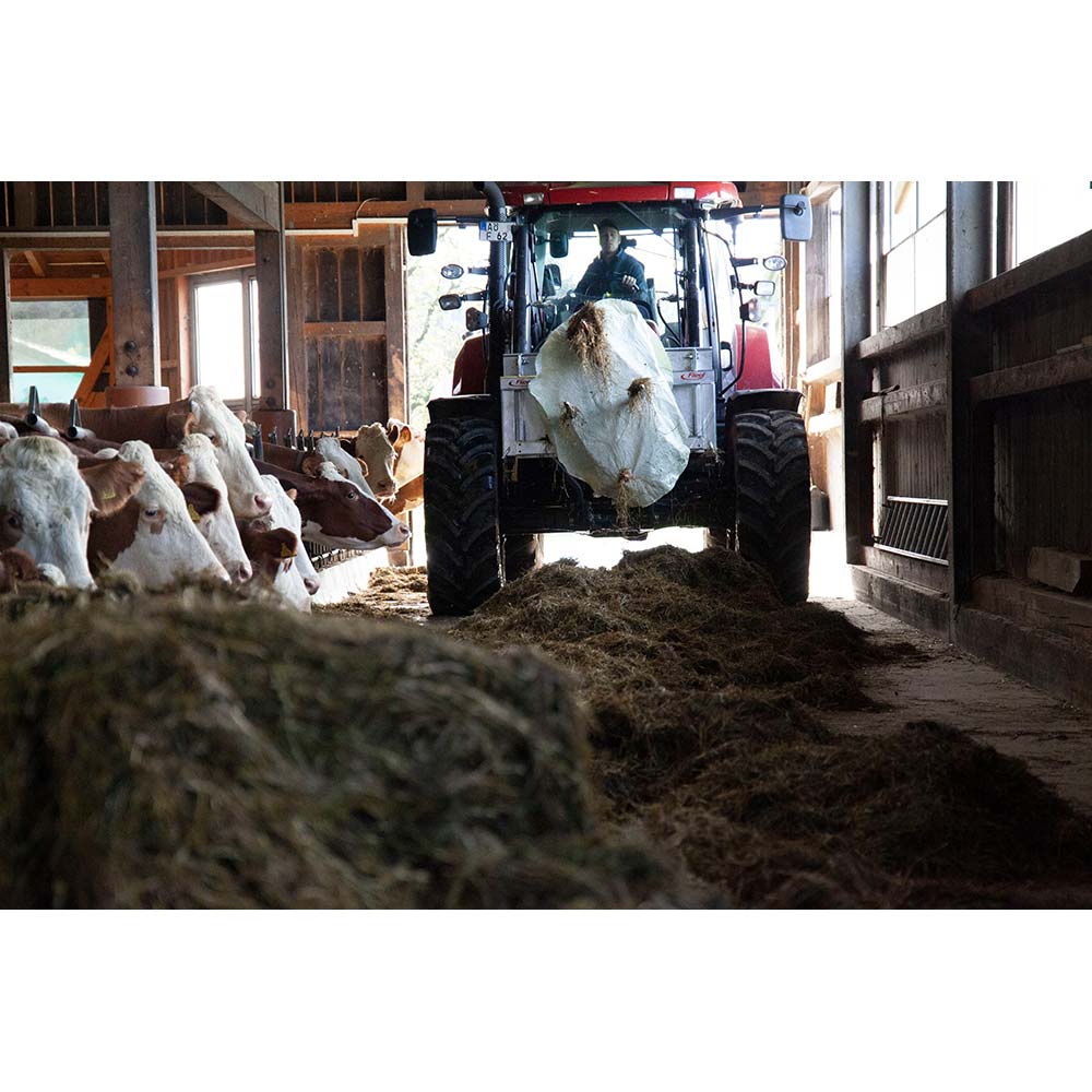 Déroulement simple et rapide des balles d'ensilage et de paille via l'hydraulique du tracteur – convient également au transport.
