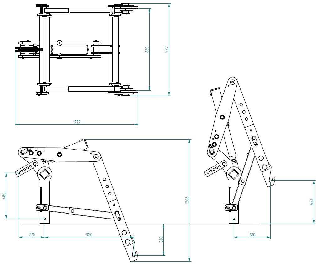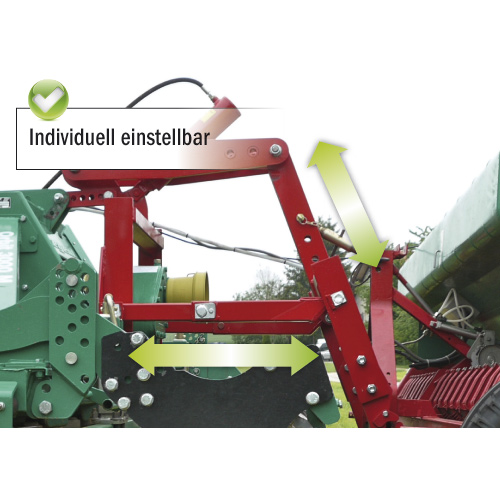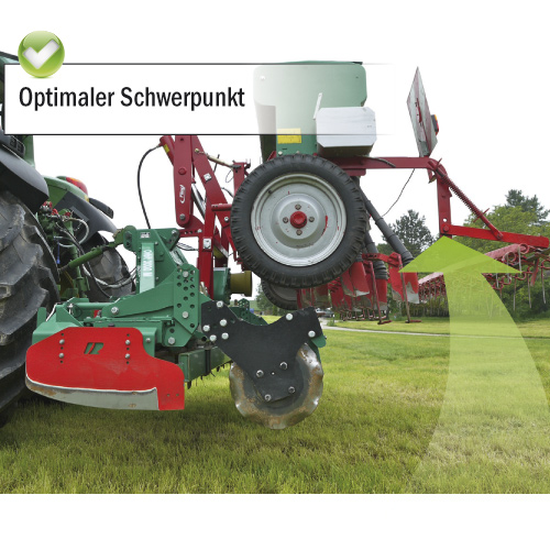 » La symétrie singulière et le vérin hydraulique simple effet lourd permettent aux semoirs d'être surélevés et orientés sans problème par rapport à l'essieu arrière du tracteur. Le centre de gravité du module combiné se déplace alors vers l'avant. L'essieu avant du tracteur reste chargé et la maniabilité est maintenue.